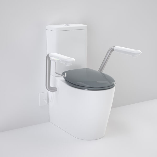 Includes integrated stainless steel armrests (load tested to 160kg, no structural wall required for install, inbuilt safety locking mechanism, Includes toilet roll holder on arm)
